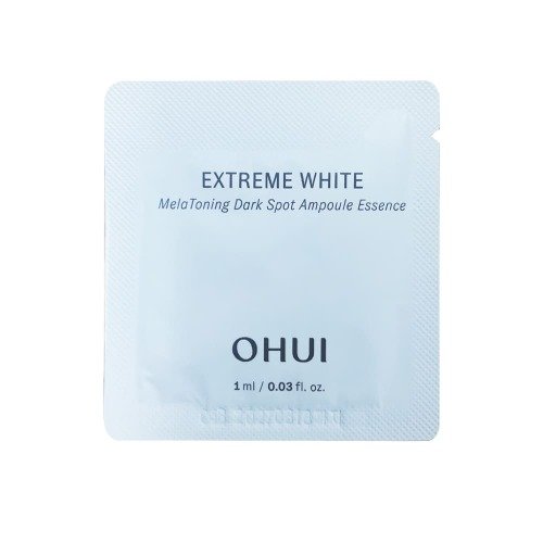 OHUI EXTREME WHITE Mela Toning Dark Spot Ampoule Essence — это мощное осветляющее средство, разработанное для борьбы с пигментацией и неравномерным тоном кожи. Эта эссенция, содержащая SNOW VITAMIN+™ и ниацинамид, эффективно осветляет тёмные пятна, устраняет пигментацию и повышает увлажнение кожи. Упакованная в удобные одноразовые саше по 1 мл, она идеально подходит для путешествий или для поддержания осветляющего ухода на ходу.